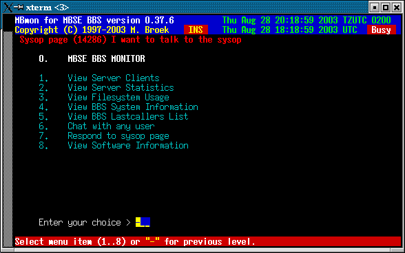 mbmon is the monitor program so that you can see what is happening on your bbs. It can show all processes and actions of all programs, show system statitistics, disk useage, and the last callers list. mbmon must run on the same system where the bbs is. When started it will also report that the sysop is present on the system for chat so that users of your bbs can page you for a chat. If a user pages you, this will be shown in every screen of mbmon and a beep will sound every few seconds.